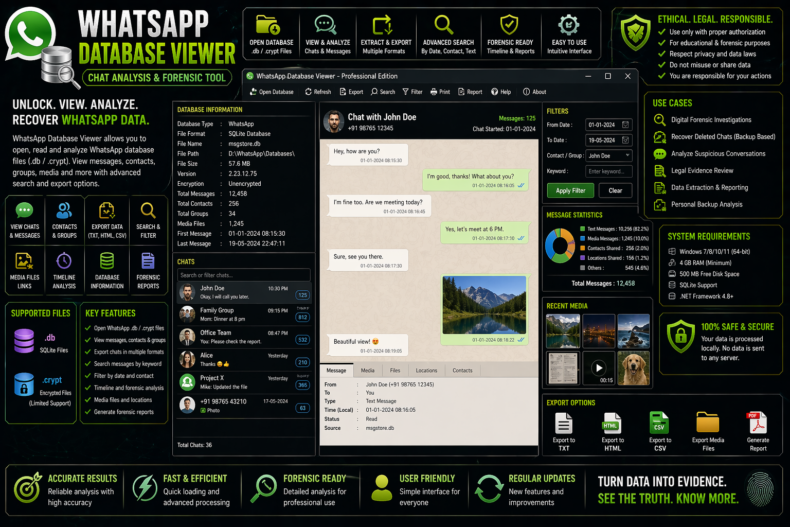WhatsApp Database Viewer (often distributed as WhatsApp-Database-View) is a specialized tool used to open, read, and analyze WhatsApp database files (usually .db or .crypt backups).